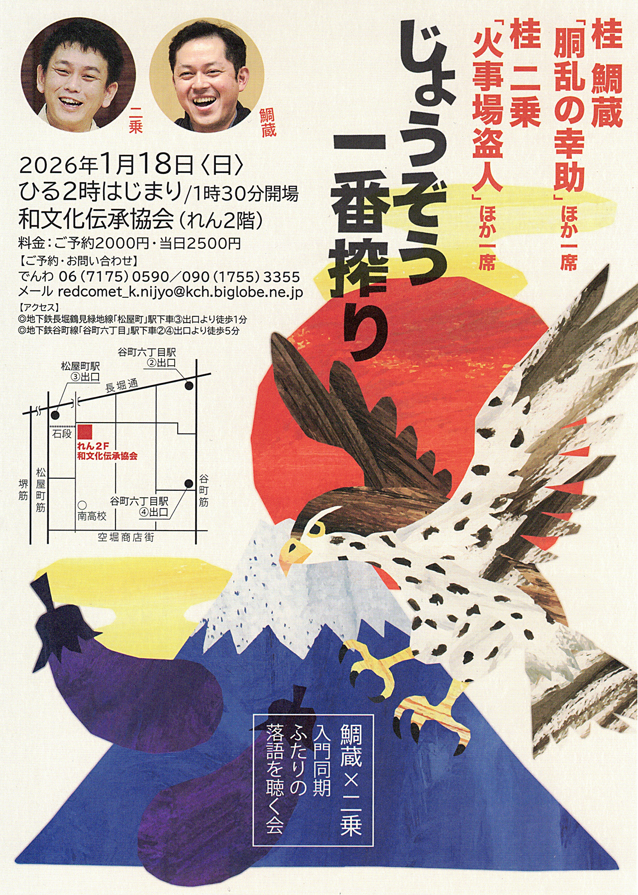 桂 鯛蔵・桂 二乗の落語会 日 時:令和8年1月18日(日) 14:00~(13:30開場) 料 金:ご予約2000円/当日2500円